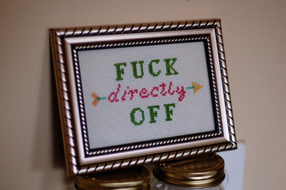 Cross stitch pattern (not finished object!!) of the sign I hang on my door. Great for letting visitors know how you feel, or as a gift to your favorite frenemy.